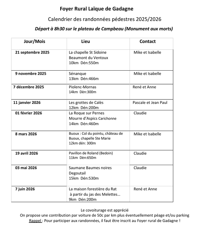 Du mois de Septembre au mois de Juin, en principe le 1er ou le 2ème dimanche du mois, nous organisons une randonnée